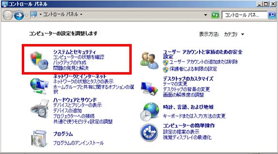 コントロールパネル画面を開き、システムとセキュリティをクリックする。