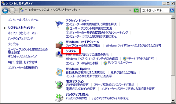 システムとセキュリティ画面が開いたら、システムをクリックする。