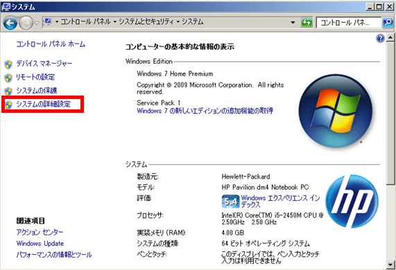 システム画面が開いたら、システムの詳細設定をクリックする。