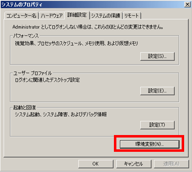 システムのプロパティ画面が開いたら、環境変数ボタンを押す。