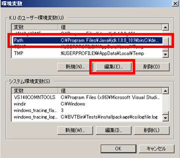 環境変数画面が表示されたら、ユーザ環境変数の変数Pathを選択して編集ボタンを押す。