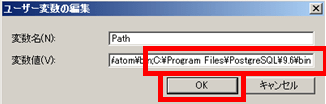 ユーザ変数の編集画面が表示される。変数値に既に設定されているパスの後に「;」を付けて、PostgreSQLをインストールしたディレクトリにある実行ファイル(.exe)が格納されているサブディレクトリ(\bin)を絶対パス名で追加する。ここでは、ディレクトリC:\Program Files\PostgreSQL\9.6\binを追加している。