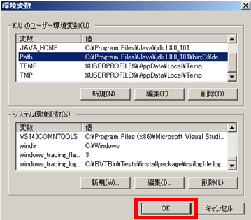 環境変数の画面に戻るので、OKボタンを押す。これで、PATHの設定は終わりだ。