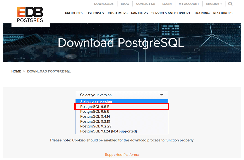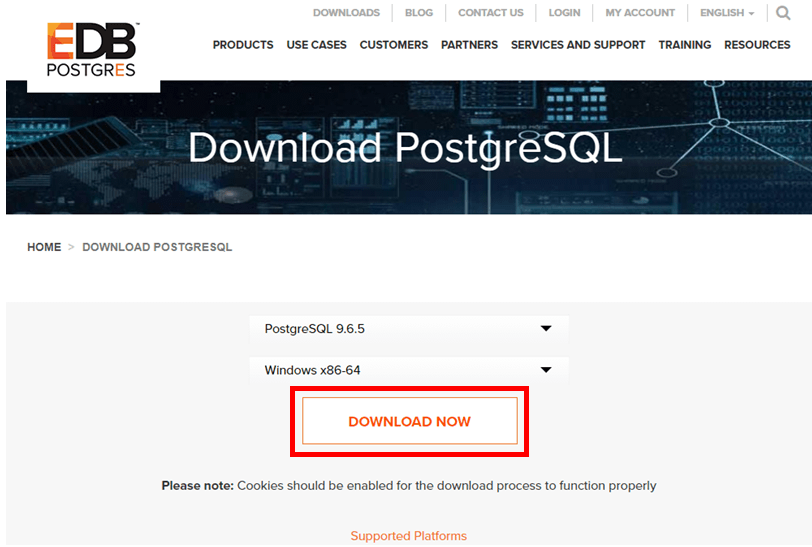 選択したバージョン:PostgreSQL9.6.5とOS:Windows x86-64を確認して、DOWN LOAD NOWボタンを押す。これで、インストーラーのダウンロードが始まる。