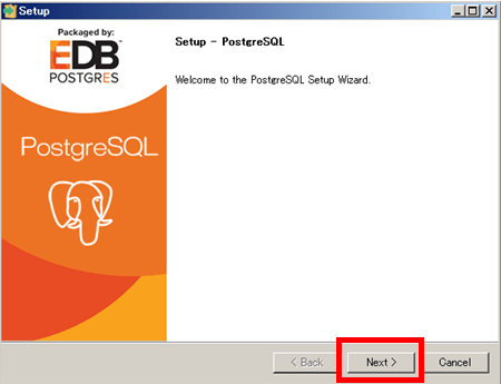 「Setup – PostgreSQL Welcome to the PostgreSQL Setup Wizard.」画面が表示されたら、Nextボタンを押す。