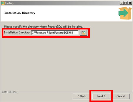 Installation Directory画面が表示されたら、PostgreSQLをインストールするディレクトリをInstallation Directoryに設定する。デフォルトのディレクトリでもよいし、独自に設定することも可能だ。