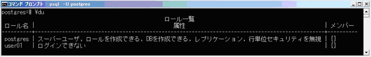 以下の例はスーパーユーザpostgresがuser01という名前のロールを作成しているところだ。