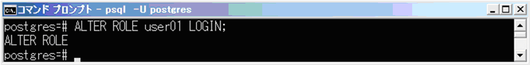 先のセクションで作成したuser01にログイン権限を与えるためにALTER ROLE user01 LOGINとコマンドを叩く。