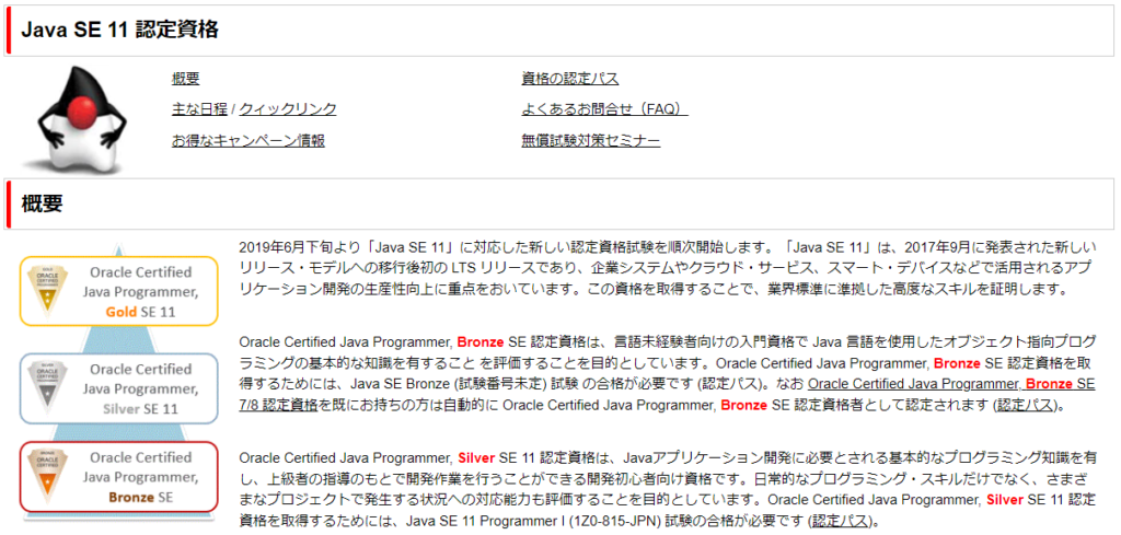 この「Java SE 11 認定資格」には3つの段階がある。プログラミングは初めてという入門者向けのBronze、基本的な知識を持っていて上級者の下で指導を受けて開発を行う開発入門者向けのSilver、上級者向けのGoldである。