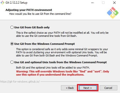 PATH環境変数の設定方法を選択する。デフォルトの「Use Git from the Windows Command Prompt」で問題ない。