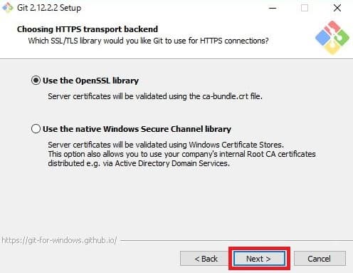 HTTPS経由でGitを使う時の設定だ。とりあえずデフォルトの「Use the OpenSSL library」で問題ない。