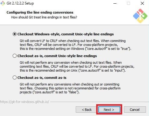 改行スタイルの設定を行う。デフォルトの「Checkout Windows-style, commit Unix-style line endings」のまま進める。