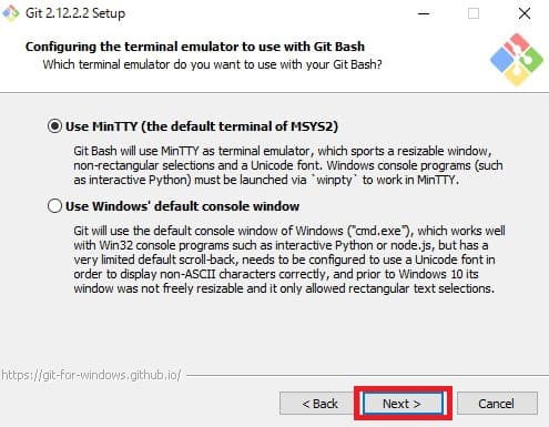 コマンドラインでGitを実行するGitBushの設定を行う。デフォルトの「Use MinTTY(the default terminal of MSYS2)」のままで問題ない。