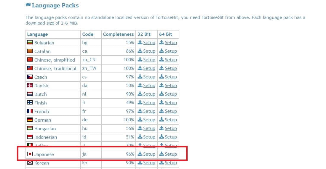 本体をダウンロードした同じページに「Language Packs」の覧があるので、そこから「Japanese」のセットアップファイルをダウンロードしよう。