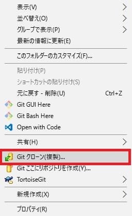 リモートリポジトリをクローンしてローカルリポジトリを作成する。エクスプローラーで右クリックから「Gitクローン(複製)」を選択する。例として「C:\repo-work」にクローンを作成しよう。