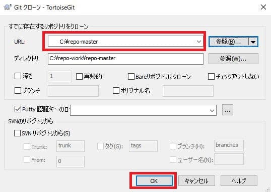 ダイアログが表示されるので、「URL」覧にリモートリポジトリのURLを入力する。今回は最初に作成したリポジトリをリモートリポジトリとして指定した。準備が整ったら「OK」ボタンでクローンを作成しよう。