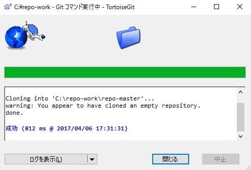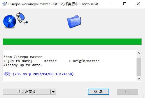プルを実行するとプル状況ダイアログが表示され、リモートリポジトリの内容をローカルリポジトリに反映される。
