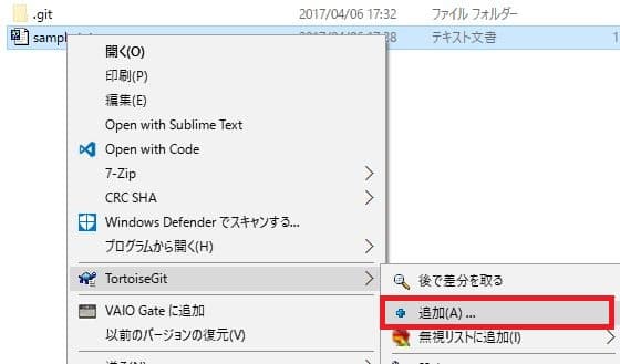 作成したファイルを右クリックし、[TortoiseGit]-[追加]を選択する。