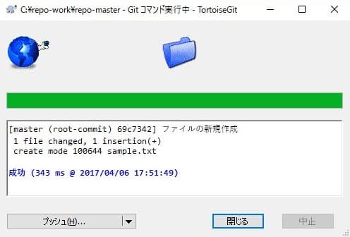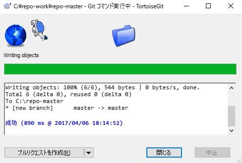 プッシュを実行するとプッシュ状況ダイアログが表示される。無事プッシュが成功すればリモートリポジトリにファイルが反映される。