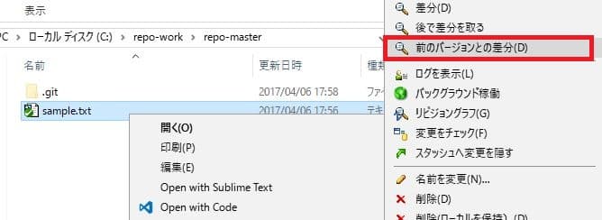 ここでは前にコミットしたファイルとの差分を表示してみよう。差分を表示したいファイルを右クリックし、[TortoiseGit]-[前のバージョンとの差分]を選択する。