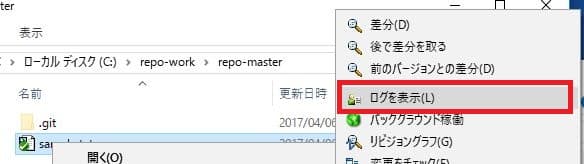 同じようにファイルの変更ログを表示することができる。コミットの差分を表示したいファイルを右クリックし、[TortoiseGit]-[ログを表示]を選択する。