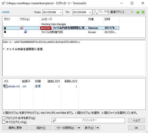 コミット時のメッセージがダイアログの上部に表示される。しっかりメッセージがに登録されていれば、ここを見るだけでどのような変更があったのかを理解することができるのだ。