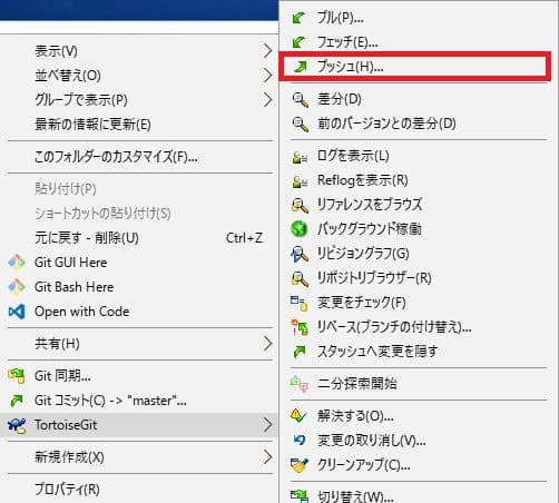 エクスプローラーでローカルリポジトリを開き、何もない場所を右クリックして[TortoiseGit]-[プッシュ]をクリックしよう。