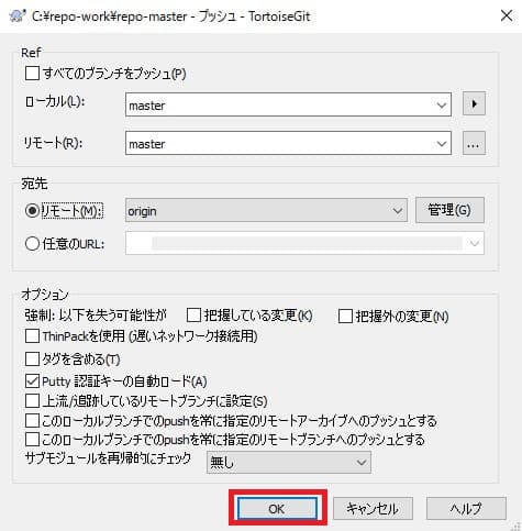 プッシュダイアログが開くので宛先を確認して「OK」ボタンをクリックしよう。宛先の「origin」はクローンした際に自動的に設定される内容で、リモートリポジトリを意味する。