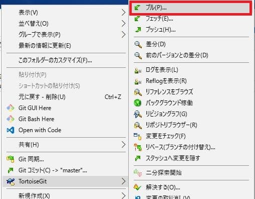 最後にプルの方法を紹介しておこう。エクスプローラーでローカルリポジトリを開き、何もない場所を右クリックして[TortoiseGit]-[プル]をクリックする。
