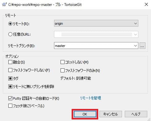プルダイアログが開くので、取得するリモートリポジトリを確認したうえで実行しよう。