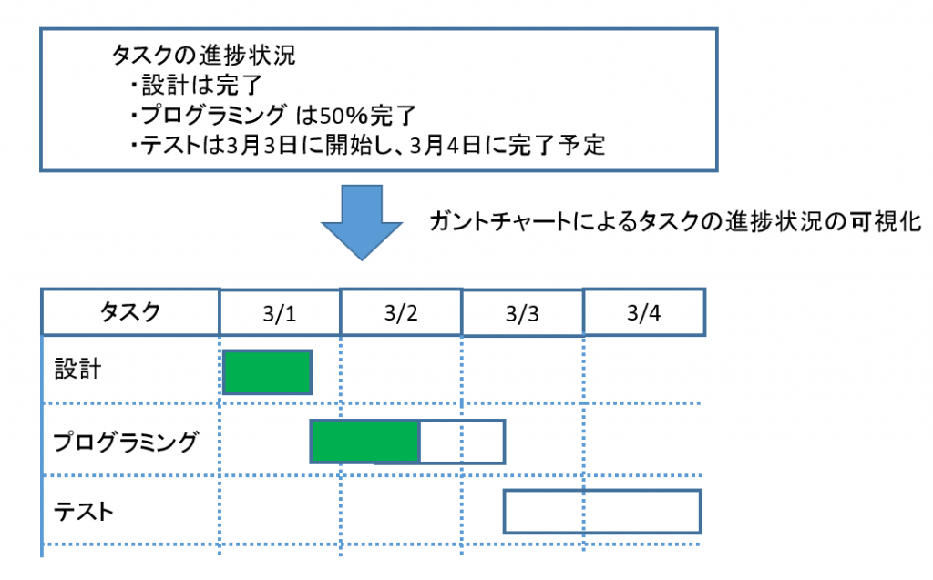 また、タスクの数が少なければプロジェクトのメンバー全員に送られるメールの文書でもプロジェクトがどれくらい進んでいるかを知らせるのはそれほど難しくないだろう。しかし、タスクの数が多くなると文書では難しい。やはり直感的に理解できるチャートが必要だ。