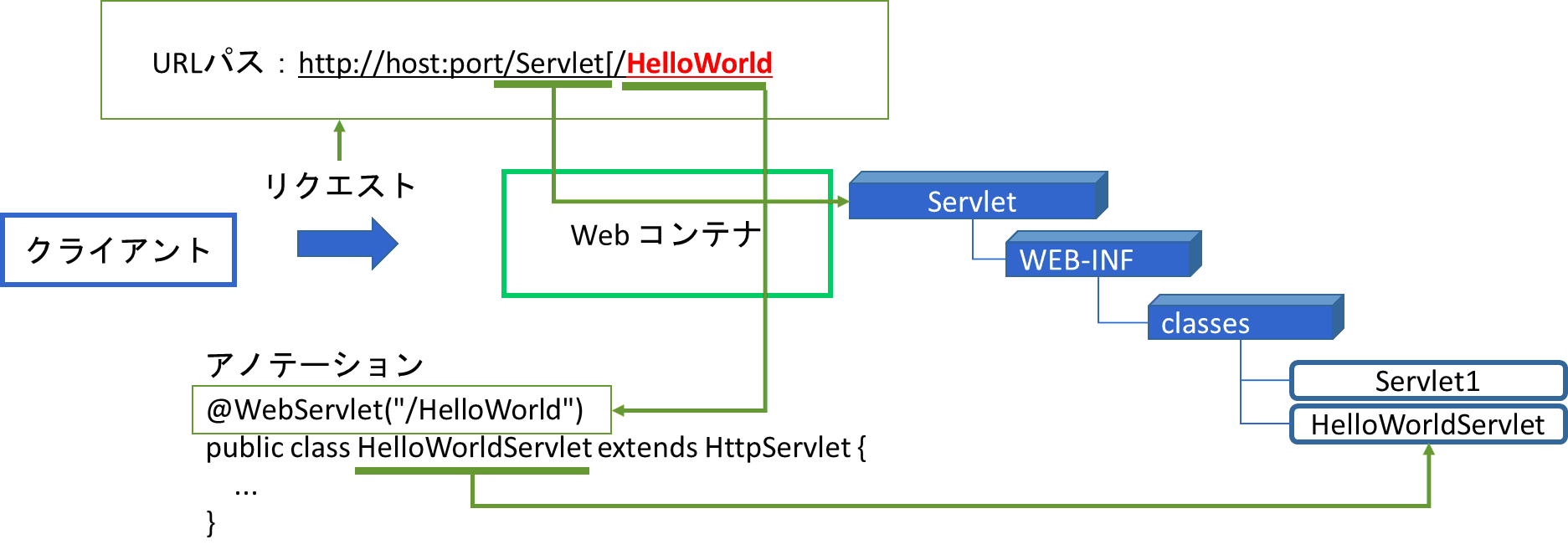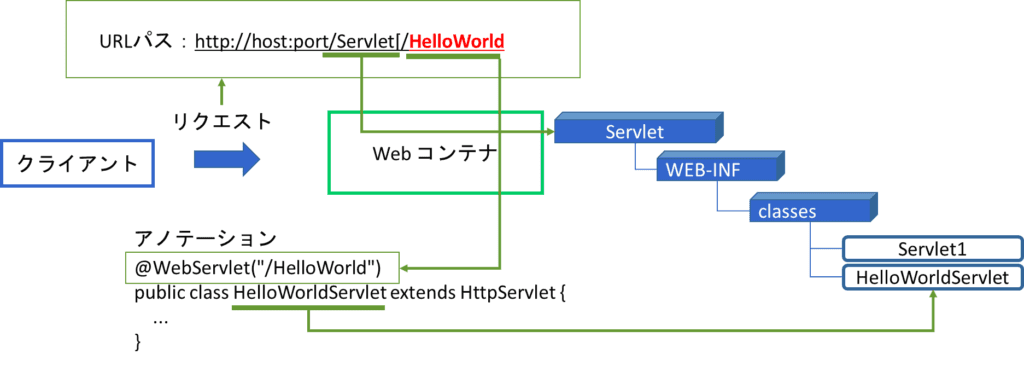 この関係をまとめてみると次の図のようになる。Webコンテナがリクエストの中のURLパスに含まれるコンテキストルートServletとアノテーション/HelloWorldからサーブレットを選択する。