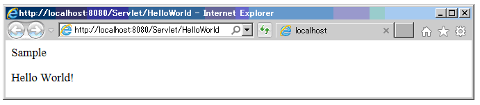 ブラウザにURL:http://localhost:8080/Servlet/HelloWorldを入力し、Enterを押す。