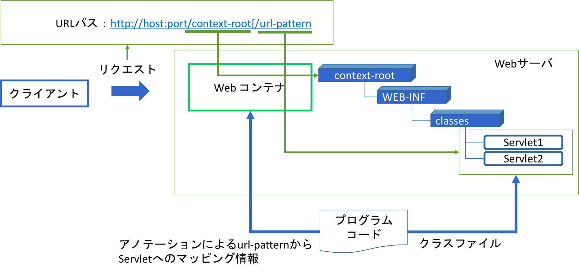 クライアントがリクエストにURLパスを指定してWebサーバーに送ると、WebサーバーにあるWebコンテナが対応するサーブレットにリクエストを渡してくれる。この時、URLパスの中のurl-patternからサーブレットへのマッピング情報は、アノテーションとしてサーブレットクラスのコードの中に宣言されている。次の図はURLパスからどのように、サーブレットへマッピングされるかを示している。