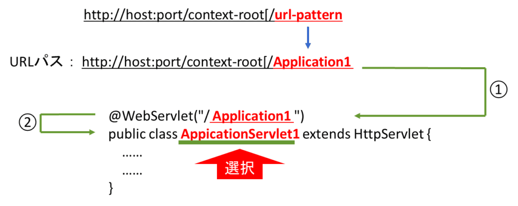 - リクエストのurl-patternがApplication1であれば、@WebServlet("/ Application1 ")の宣言と一致する。