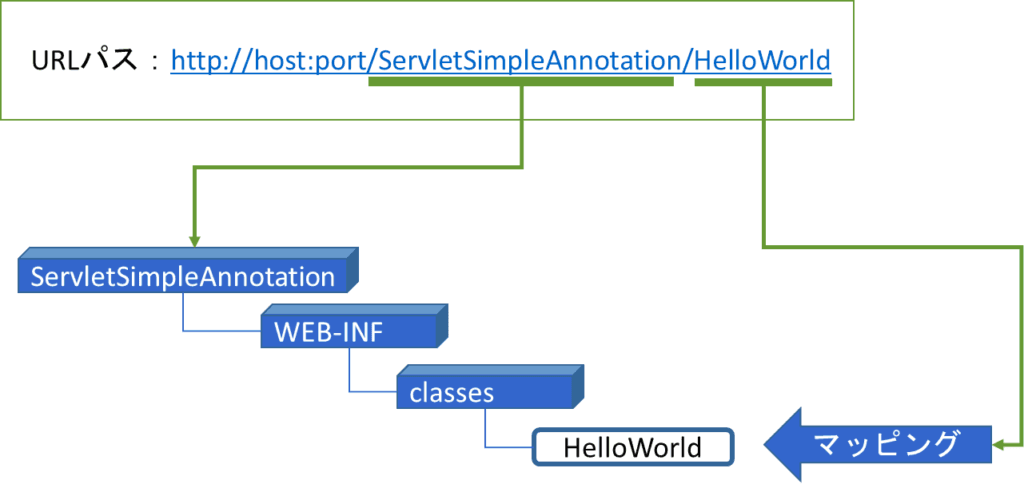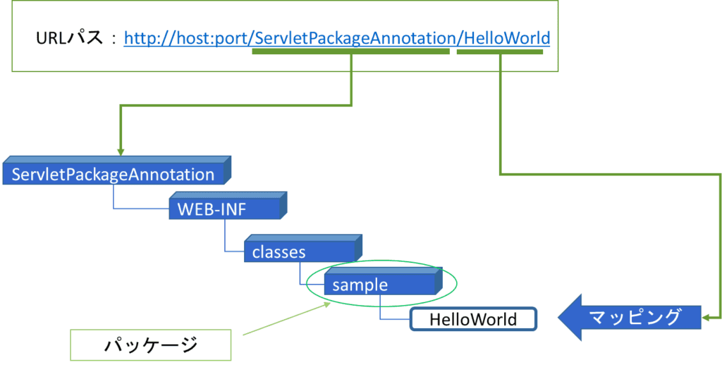 URLパスよって呼び出されるサーブレットクラスの場所は次の図の通りである。また、URLパスとサーブレットのマッピングはアノテーションによって宣言されている。