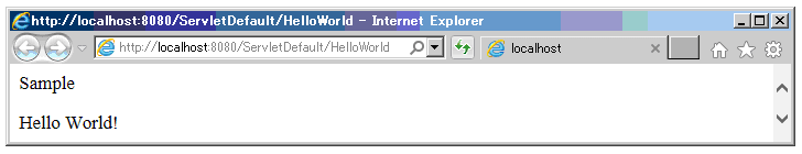 サンプルプログラムのHelloWorldは、「シンプルなアノテーションのサンプルプログラム」と同じである。またDefaultServletも、基本的に「シンプルなアノテーションのサンプルプログラム」と同じである。違いは、クラスの名前と画面の表示だけである。