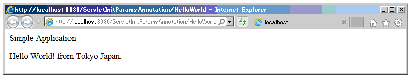 このサンプルプログラムは、アノテーション@WebServletに@WebInitParamを追加して、サーブレットに初期属性を宣言している。サーブレットは、その初期属性を使って「Hello World!」に続いて都市と国を表示するレスポンスを返す。