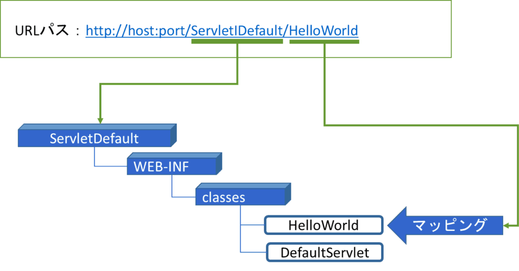 コンテキストルートはServletDefaultなので、HelloWorldを呼び出すクライアントからのパスは以下のようになる。
