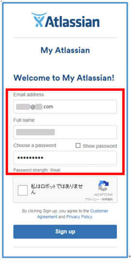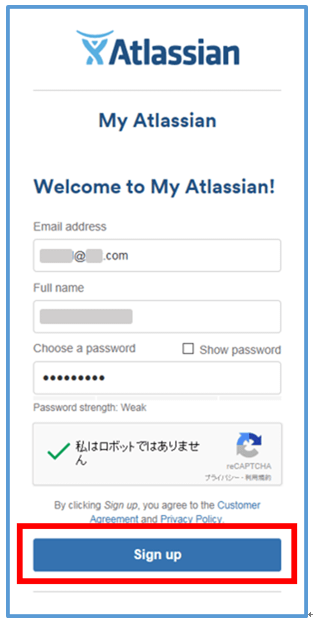 「Atlassianにようこそ(Welcome to My Atlassian)」画面が表示される。Email addressにユーザのメールアドレス、Full nameにユーザの名前、Choose & password にパスワードを入力する。これらの項目の入力が終わったら「私はロボットではありません」を押す。