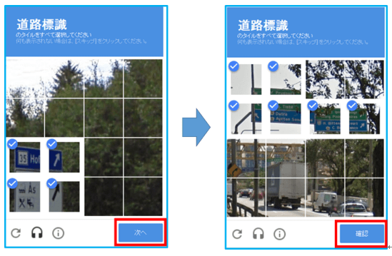 画像を使った質問が表示されるので、質問に合った画像にチェックを入れ次へのボタンを押す。そうすると、もう一度同じ質問の画面が続くので同じようにチェックを入れ確認ボタンを押す。