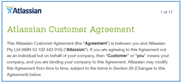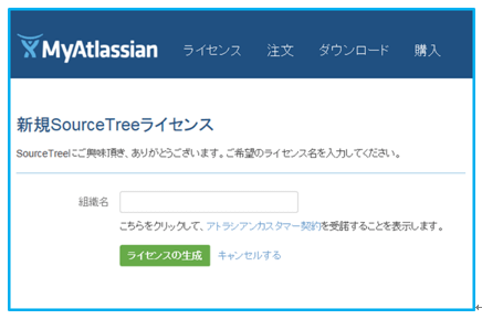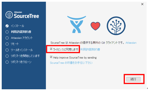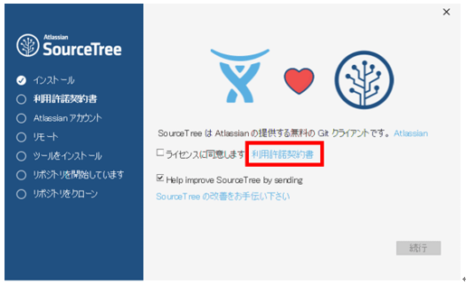 SourceTreeを利用する顧客とその開発元であるAtlassian間の利用許諾契約書が表示される。内容を読んで確認する。