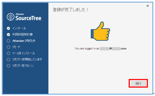 アカウントとパスワードの登録が完了すると、「登録を完了しました!」画面が表示されるので、続行ボタンを押す。