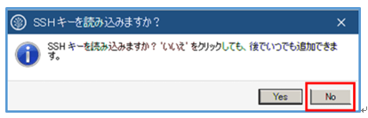 「SSHキーを読み込みますか?」の画面が表示されたら、Noボタンを押す。