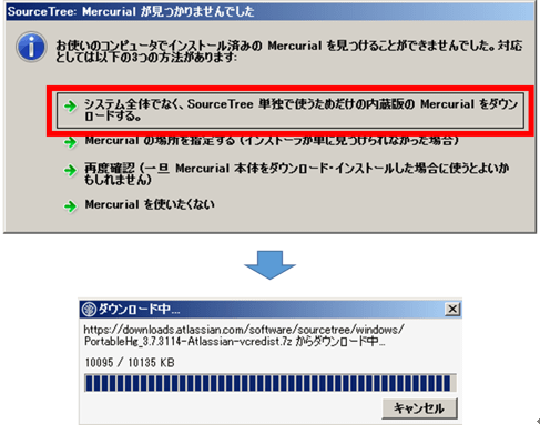 「システム全体でなく、SourceTree単独で使うためだけの内蔵用のMercurialをダウンロードする。」を押す。そうすると、ダウンロードが始まる。