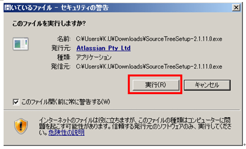 インストーラーを起動すると、最初に「セキュリティの警告」の画面が表示されるので、「実行」ボタンを押す。