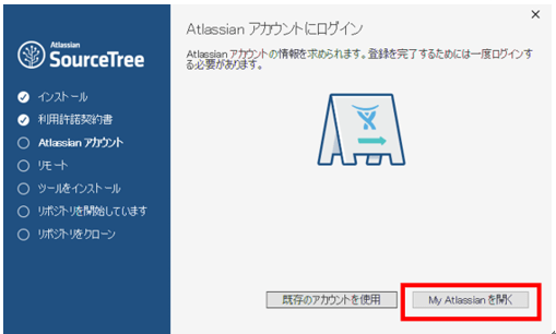 「Atlassian アカウントにログイン」画面が開いたら、Atlassian アカウントを持っている場合と持っていない場合で操作が異なる。アカウントを持っていないときは「My Atlassianを開く」ボタンを押す。