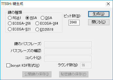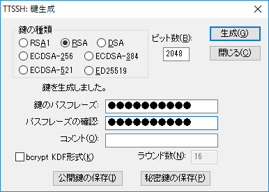 形式はRSA、キー長は2048で問題ない。「生成」をクリックする。