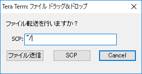 ログインしたら、先ほど作った「id_rsa.pub」をTeraTermにドラッグアンドドロップしよう。するとボックスが出現するので、送り先のディレクトリを指定する。今回は「~/」とする。指定したら「SCP」をクリックしよう。