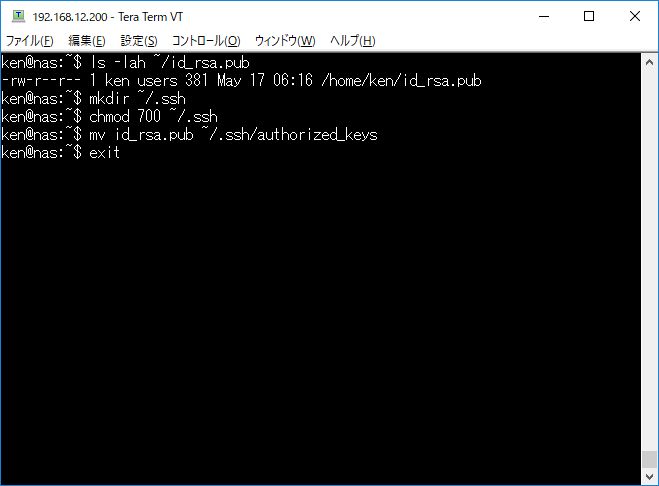 保存したら一度TeraTermを閉じて再度、接続先に接続、通常通りログインしよう。まだキーの設定をしていないので今から設定する。